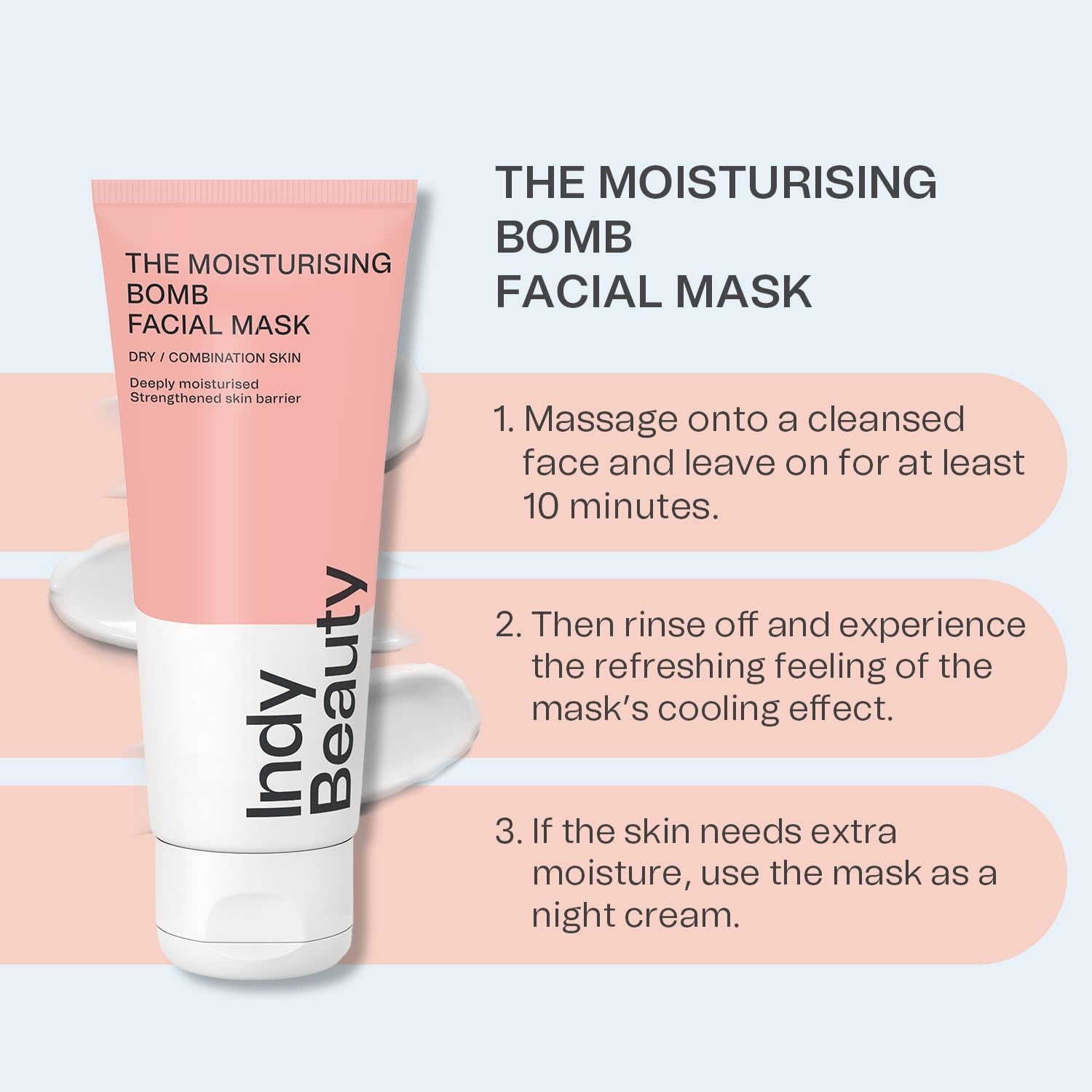 -  HOW TO USE INDY BEAUTY MOISTURISING FACIAL MASK: Massage onto a cleansed face and leave on for at least 10 minutes. Then rinse off and experience the refreshing feeling of the mask’s cooling effect. If the skin needs extra moisture, the mask can be used as a night cream.